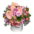 Este Arreglo viene en caja Le Florence color blanco de 15x20cm con rosas premium, anturios de invernadero, astromelias, morelianas, aquilea y follajes finos. Mide aproximadamente 35x35cm.
