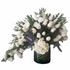 Arreglo en cilindro de cristal con rosas premium, hortensias de invernadero y lisianthus. Mide aproximadamente 55x55cm. Puede ser en color blanco, blanco y azul, blanco y rosa o también otra combinación de colores.