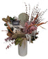 Arreglo en base de cristal con follajes preservados. Mide aproximadamente 50x40cm.