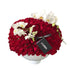 Arreglo en tazón de ceramica con 450 rosas premium y orquídeas phalaenopsis de invernadero. Mide aproximadamente 40x50cm. Puede ser en color blanco.
